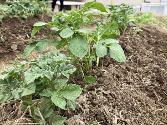 少し土の表面が固くなっていたので、土の中により多くの酸素を送り込むために、カマを使って畝の上や横から切れ目を入れたり、野菜の成長に影響があるような草は取り除いたり、ジャガイモの葉っぱの間引きもしました。