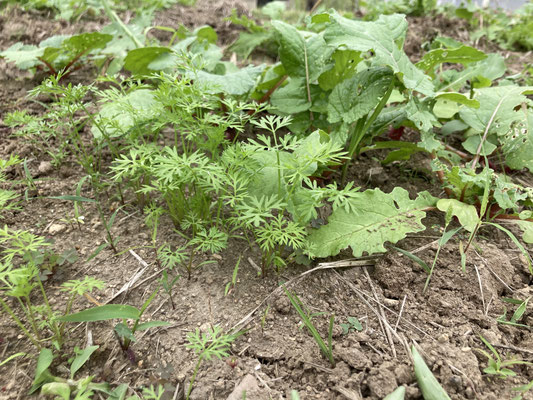 先月植えた大根、にんじん、ラディッシュ、ジャガイモの種が発芽し、大地に葉を広げてすくすくと育っていました。